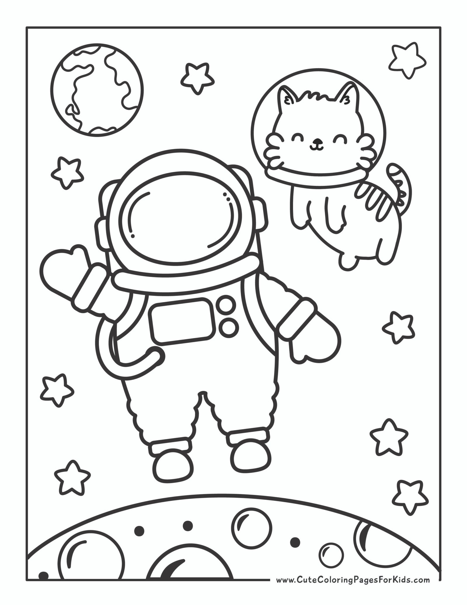 Coloring page with pictures of astronauts and a cat in space with stars and part of the moon, Earth in distant backgroundColoring page with pictures of astronauts and a cat in space with stars and part of the moon, Earth in distant background